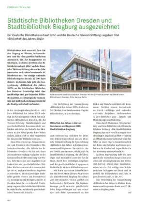 Schlagwort(e): Preis <Auszeichnung>, Bibliothek des Jahres, Städtische Bibliotheken Dresdem, Stadtbibliothek Siegburg, Bibliothek des Jahres in kleinen Kommunen und Regionen