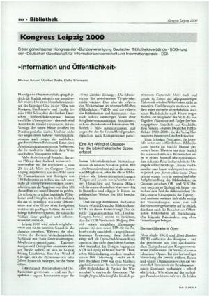 Schlagwort(e): Kongress Information und Öffentlichkeit (2000 : Leipzig), Bundesvereinigung Deutscher Bibliotheksverbände, Deutsche Gesellschaft für Informationswissenschaft und Informationspraxis, Kongress