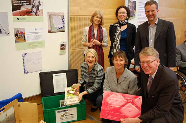 Rendsburg. Das Projekt »Picknick im Labyrinth – Medien für die Begleitung von Menschen mit Demenz« (siehe hierzu auch BuB Heft 7/8, 2013, Seite 526) der Büchereizentrale Schleswig-Holstein (BZSH) ist mit dem Schleswig-Holsteinischen Altenpflegepreis 2013 ausgezeichnet worden. Unter zehn Nominierten konnte sich das Medienangebot der Büchereizentrale durchsetzen und erhielt den mit 3.000 Euro dotierten Preis, der vom Land Schleswig-Holstein in Kooperation mit dem Landespflegeausschuss an Projekte mit besonderem gesellschaftlichen Engagement für die Pflege und Betreuung älterer Menschen verliehen wird. Die über die schleswig-holsteinischen Büchereien entleihbaren Medienboxen sind mit verschiedenen Materialien wie Vorlesegeschichten, Spielen, Fachliteratur und Multimedialem ausgestattet und werden um Weiterbildungs- und Veranstaltungsangebote ergänzt. Sie erleichtern auf vielfältige Weise den Umgang mit Menschen mit Demenz auf beruflicher, ehrenamtlicher und familiärer Ebene, so das Lob der Jury, die auch betonte, dass die Büchereien sich damit für neue Zielgruppen öffnen. Der Altenpflegepreis wird seit zehn Jahren ausgerufen und wurde den Mitarbeitern der Büchereizentrale von Sozialministerin Kristin Alheit (SPD) am 8. Januar im Kieler Landeshaus verliehen.