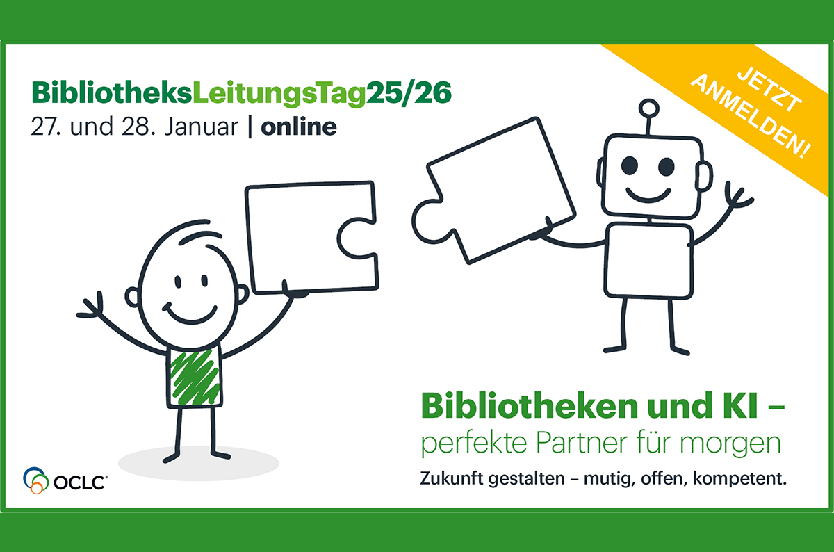Am 27. und 28. Januar 2026 findet der BibliotheksLeitungsTag 25/26 als digitale Fachveranstaltung für öffentliche und wissenschaftliche Bibliotheken statt. Unter dem Motto »Bibliotheken und KI – perfekte Partner für morgen. Zukunft gestalten – mutig, offen, kompetent.« bietet das Event zwei Tage voller praxisnaher Einblicke in die Chancen und Herausforderungen rund um Künstliche Intelligenz im Bibliothekskontext.