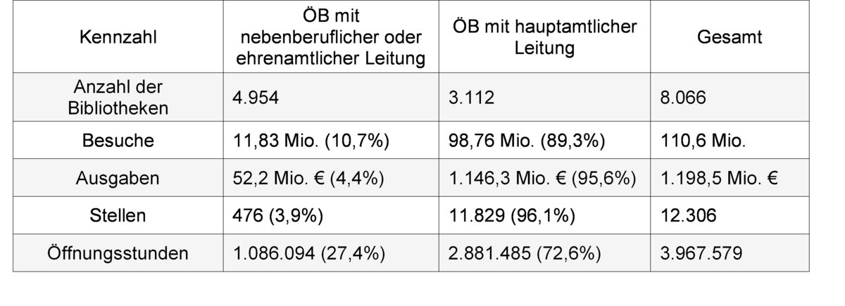 Die Deutsche Bibliotheksstatistik für 2024 weist für neben- oder ehrenamtlich geleitete Öffentliche Bibliotheken (ÖB) beeindruckende Zahlen aus. 61% aller erfassten ÖB werden neben- oder ehrenamtlich geleitet, einschließlich der Zweigstellen. 4 954 Bibliotheken mit neben- oder ehrenamtlicher Leitung stehen 3 112 hauptamtlich geleiteten ÖB gegenüber. Sie verzeichneten zusammen 11,83 Mio. Besuche, das sind 10,7 % der Besuche in allen erfassten ÖB. Die Gesamtausgaben für diese Bibliotheken betrugen 52,2 Mio. €, entsprechend 4,4 % der Gesamtausgaben aller erfassten ÖB. In diesen Bibliotheken bestanden 476 Planstellen, 3,9 % der Planstellen aller erfassten ÖB.
