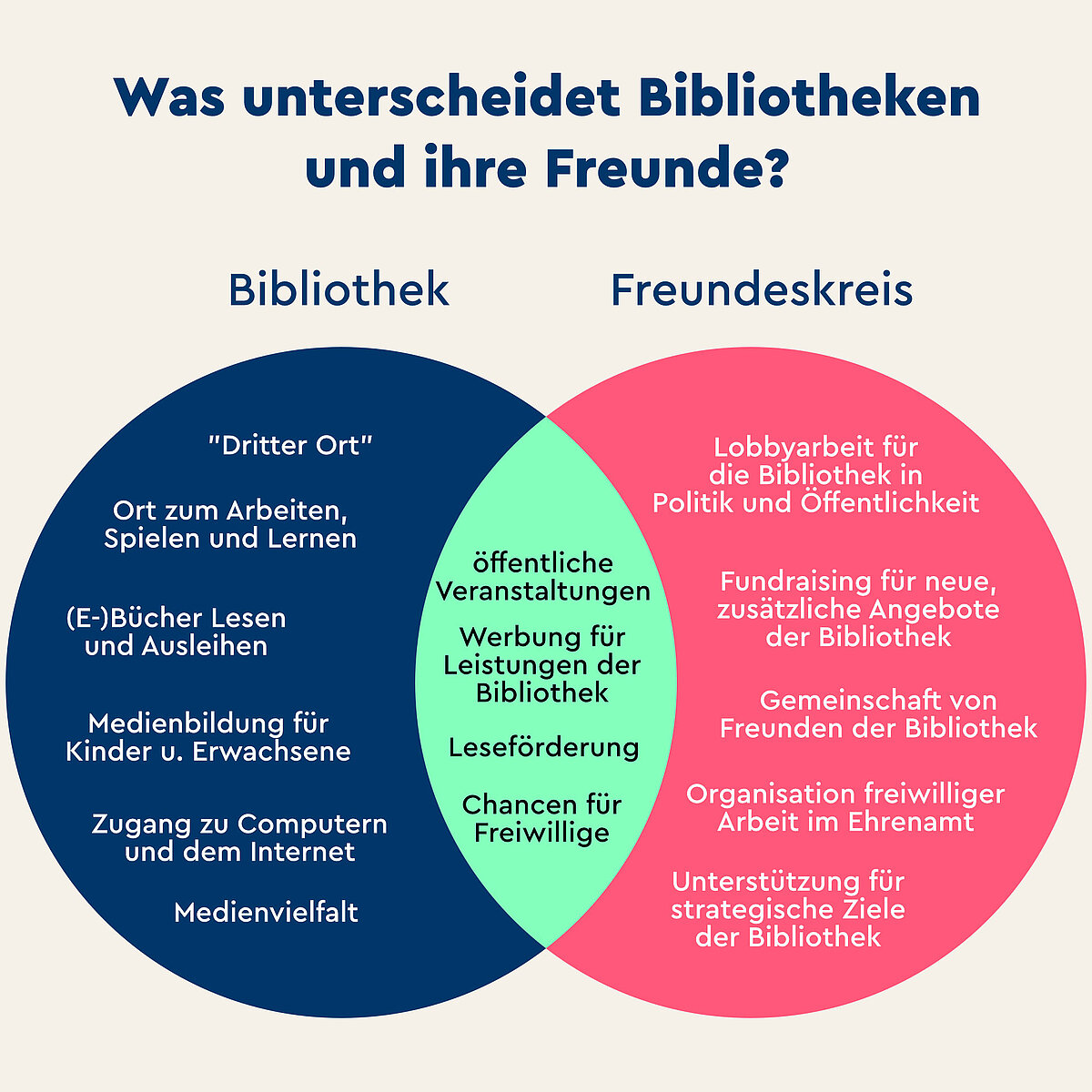 Freundeskreise schaffen Netzwerke für die Bibliothek in der Kommune, die sich für die Einrichtungen einsetzen. Sie mobilisieren ihre Mitglieder und andere zur Unterstützung bei Aktivitäten und Veranstaltungen der Bibliothek oder führen selbst literarische und andere Veranstaltungen in und mit der Bibliothek durch.