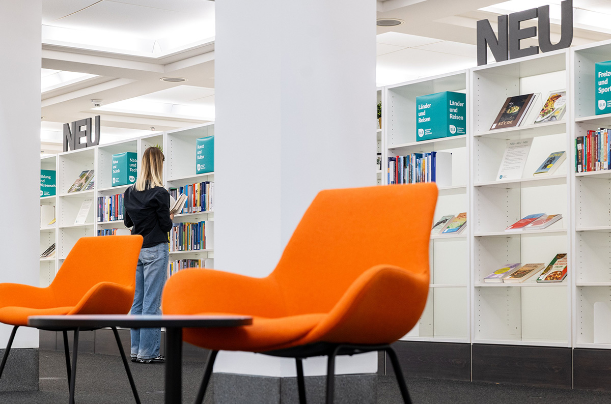 Dort findet sich nun eine weiträumige Lesezone für die aktuellen Neuerwerbungen, die die Besucher geradezu magisch anzieht. Nach Sachgruppen gegliedert, finden die neuen Bücher gleich hier ihre Leser. Gegenüber stehen die Bestseller. Aber hier gibt es täglich das Allerneueste!