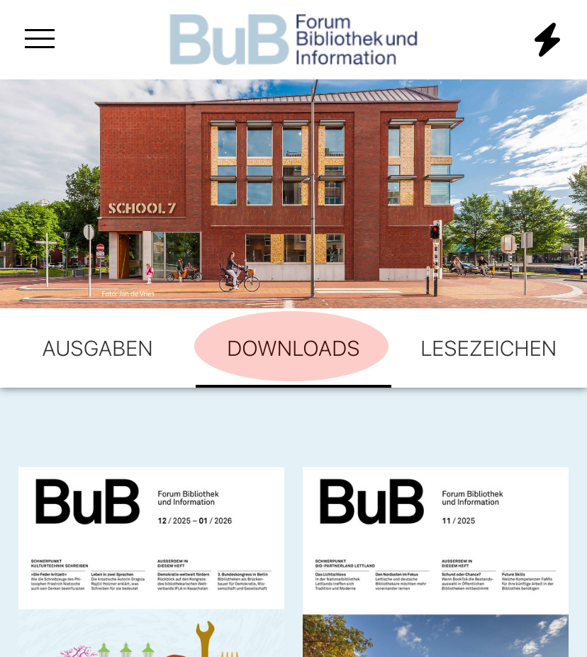 1. Unter dem Menüpunkt »Downloads« auf der Startseite der App finden Sie alle BuB-Ausgaben, die Sie heruntergeladen haben.