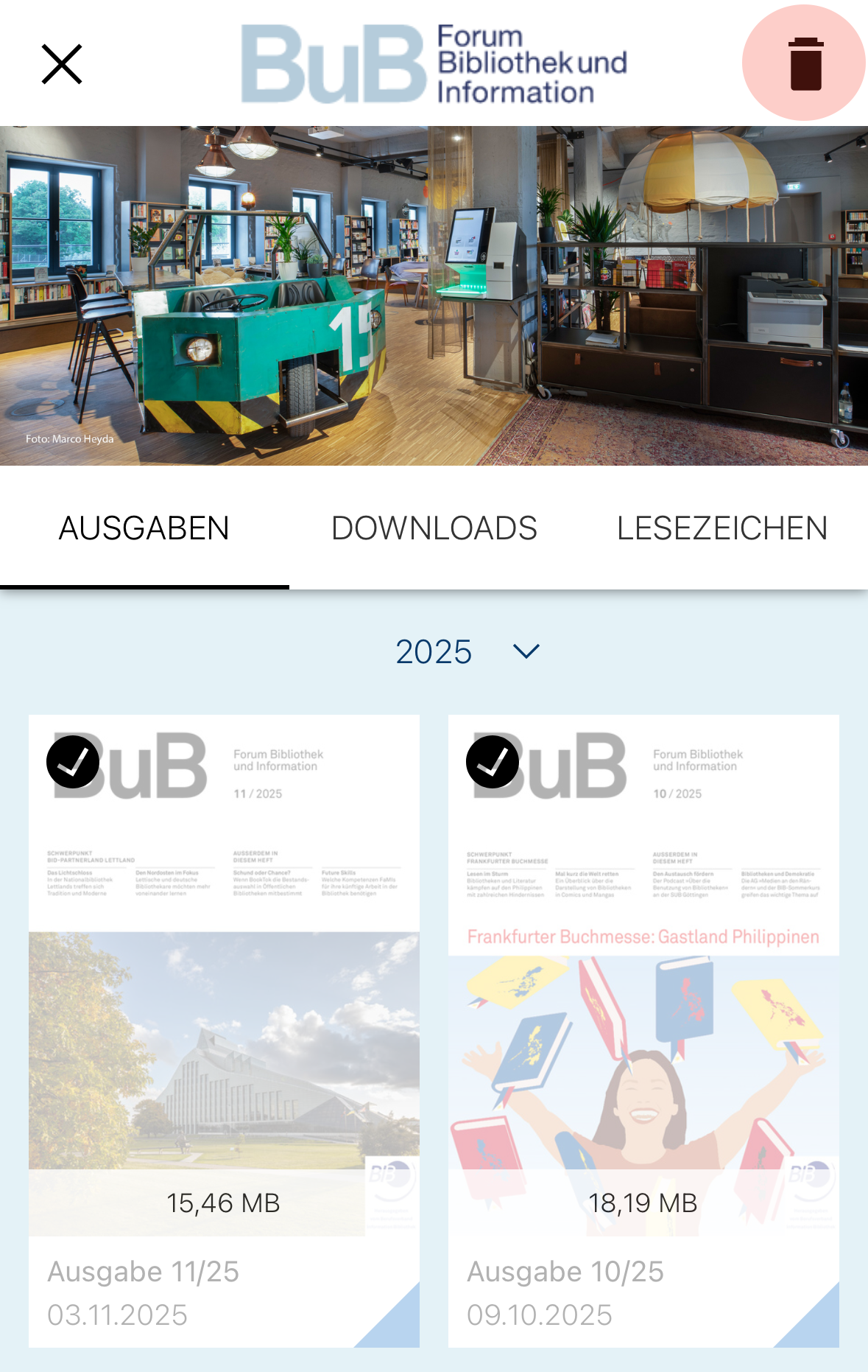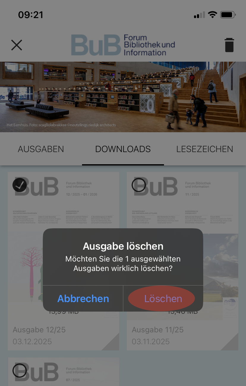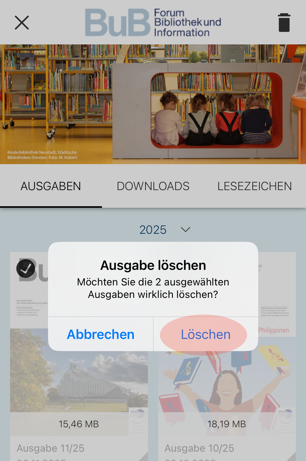 2.1 Es erscheinen Auswahlkästchen. Die ausgewählte BuB-Ausgabe ist bereits markiert. Möchten Sie weitere Ausgaben löschen, tippen Sie die entsprechenden Kästchen an.