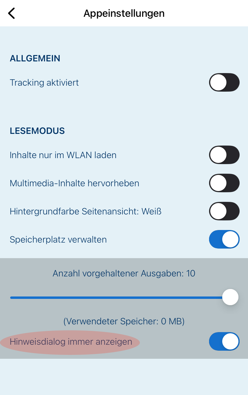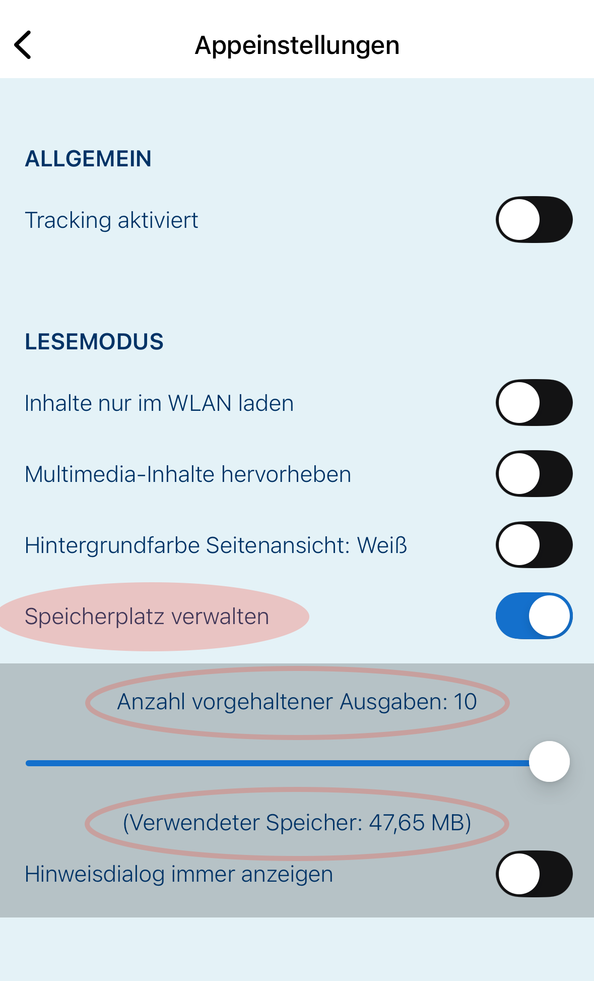 Legen Sie fest, wie viele digitale BuB-Ausgaben gleichzeitig auf Ihrem Smartphone gespeichert werden dürfen. Wird der eingestellte Maximalwert überschritten, wird automatisch die Ausgabe entfernt, auf die am längsten nicht mehr zugegriffen wurde.