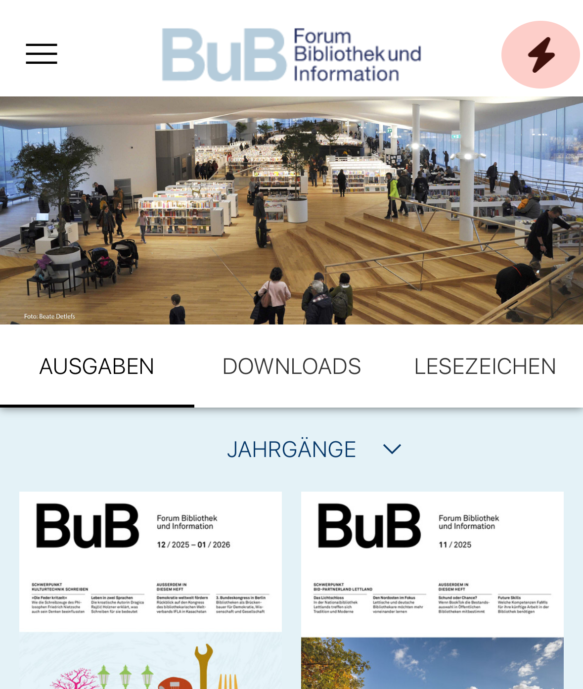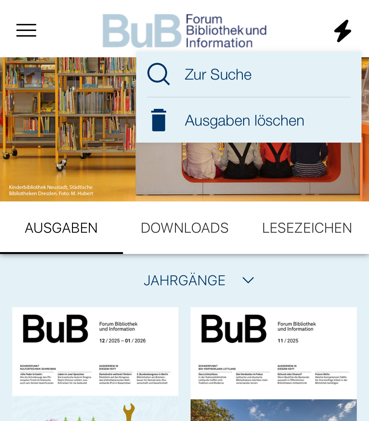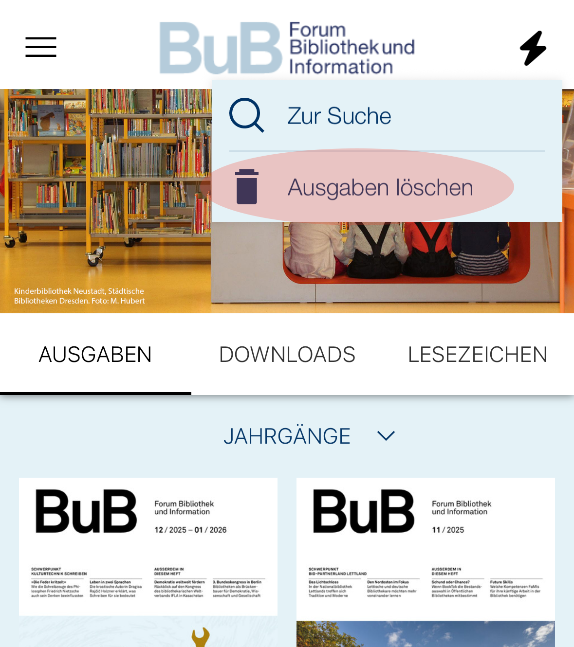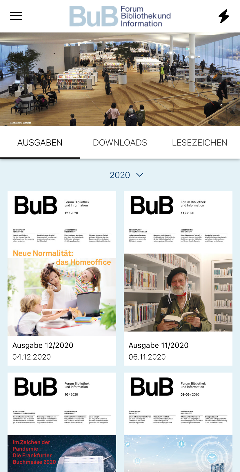 1. Unter dem Menüpunkt »Ausgaben« auf der Startseite der App finden Sie alle digitalen BuB-Ausgaben.