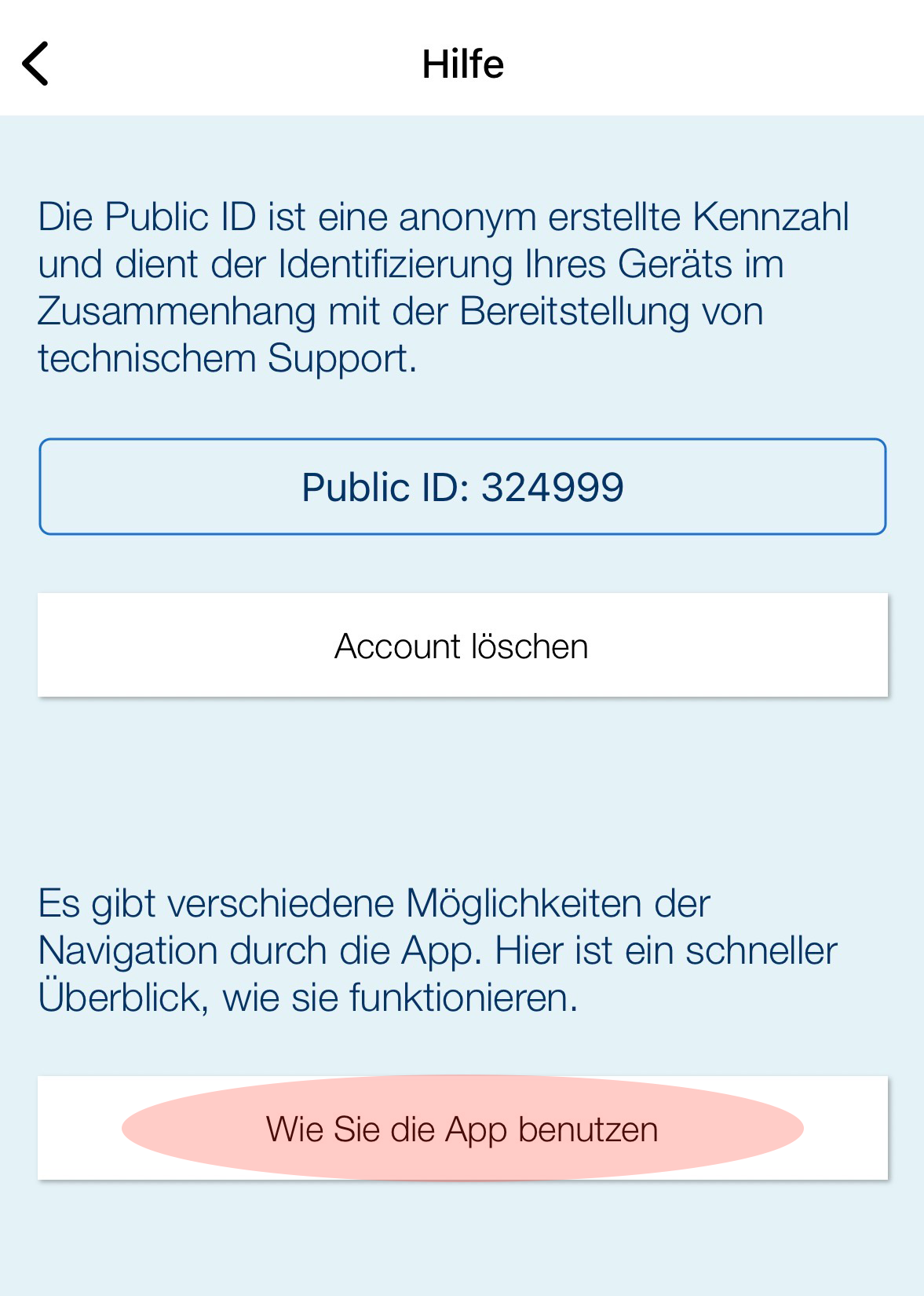 Dieser Menüpunkt bietet eine kurze Übersicht zur Bedienung der App und zeigt, wie Sie sich innerhalb der App orientieren und Inhalte aufrufen können.