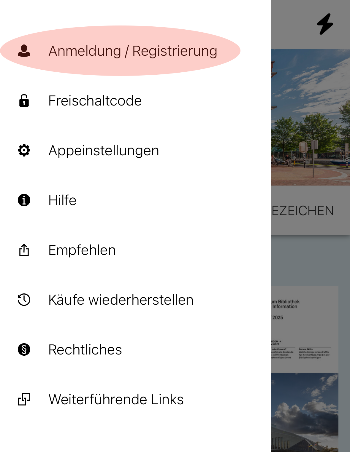 Für das Lesen der Ausgaben am Rechner müssen sich alle Nutzer zuerst mit E-Mail-Adresse und Passwort registrieren. Klicken Sie dazu oben rechts auf den blauen Pfeil und wählen den Menüpunkt „Registrierung“.