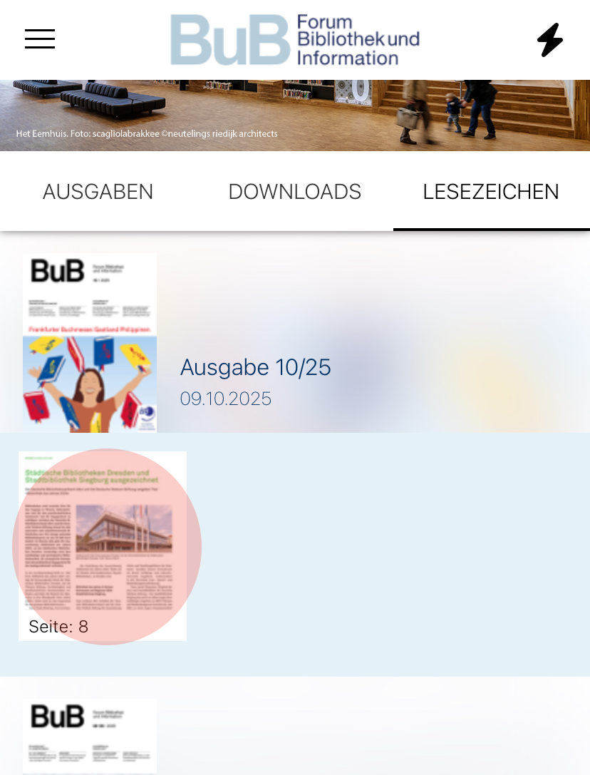1. Im Menüpunkt »Lesezeichen« finden Sie alle Lesezeichen, die Sie in Ihren BuB-Ausgaben gesetzt haben. Die Lesezeichen sind nach Ausgaben sortiert. Zu jeder Ausgabe wird die Seite angezeigt, auf der Sie ein Lesezeichen gesetzt haben.
