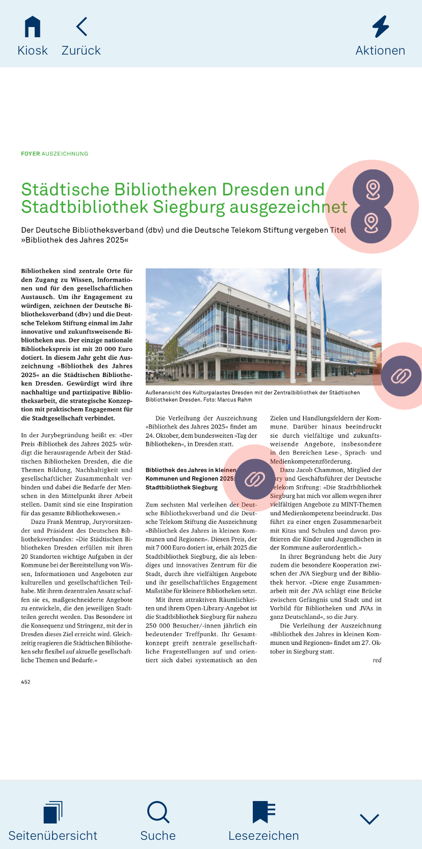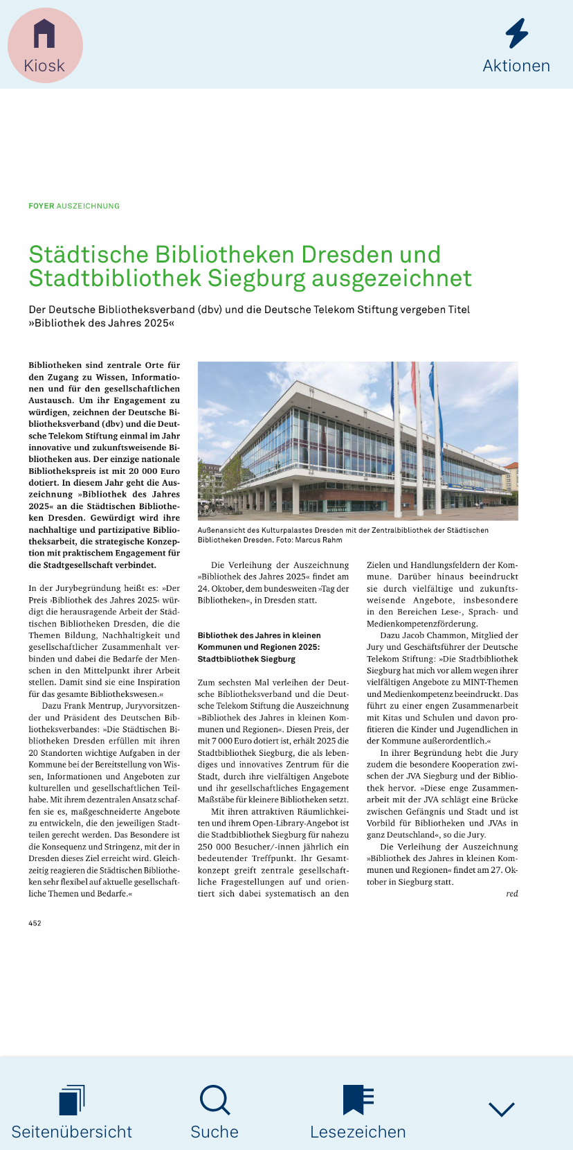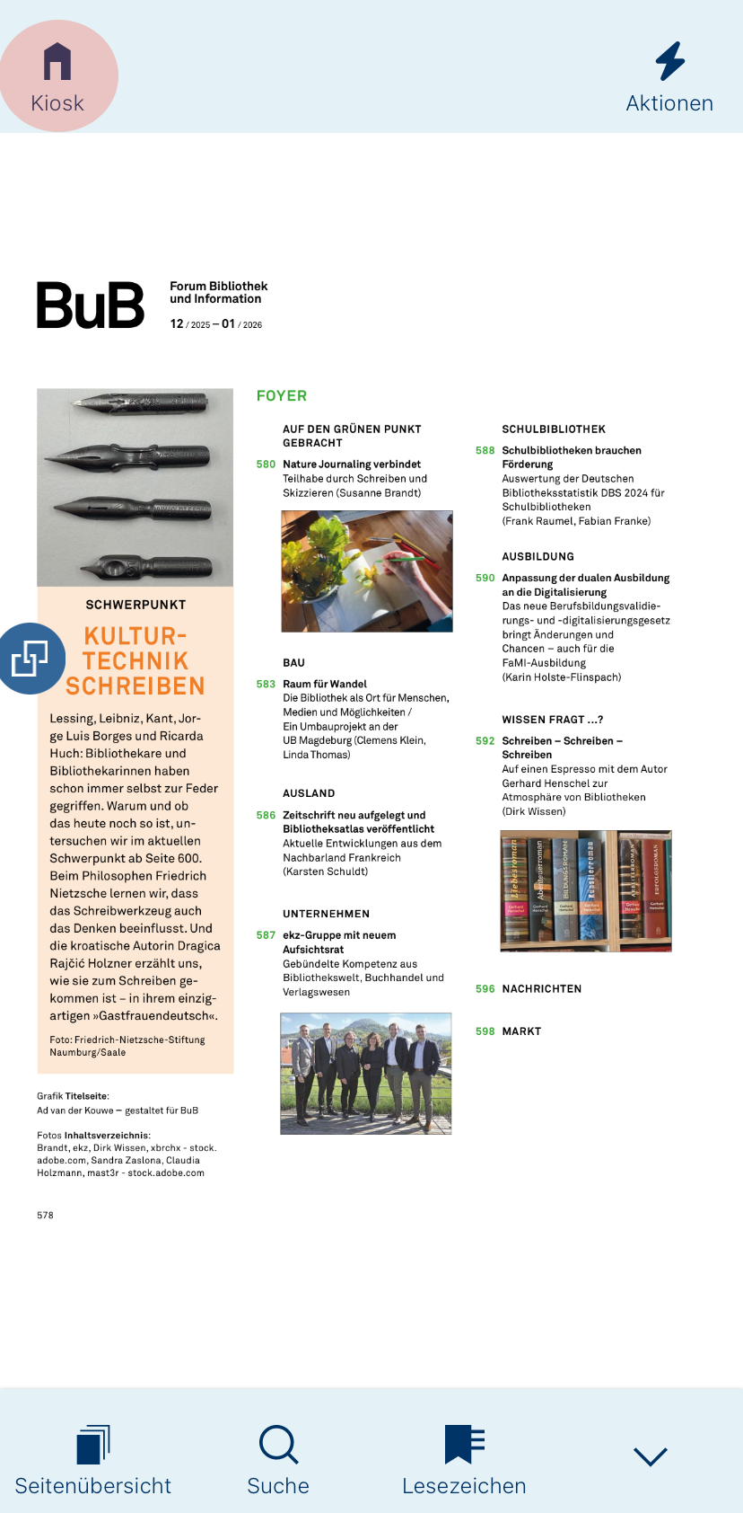 1.3 Die BuB-Ausgabe ist nun geöffnet und Sie können darin blättern und lesen. Um zur vorherigen Übersicht zurückzukehren, tippen Sie oben links auf das Kiosk-Symbol.