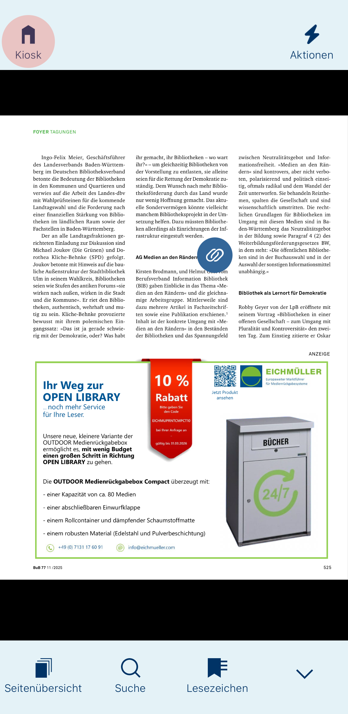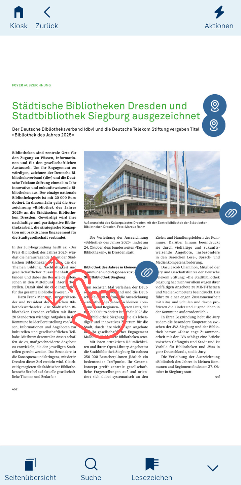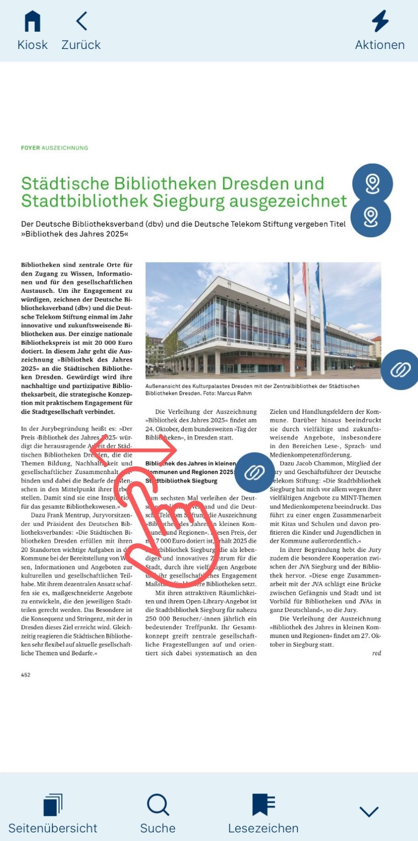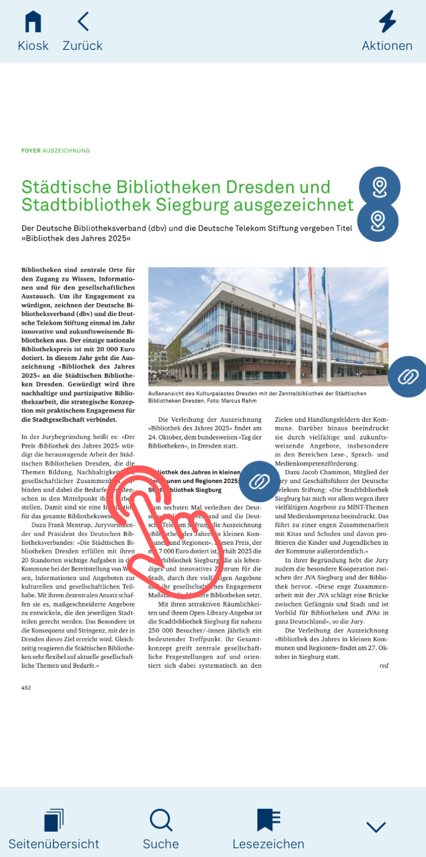 1.2 Sie gelangen direkt zur ausgewählten Seite. Um zur Lesezeichen-Übersicht zurückzukehren, tippen Sie oben links auf das Kiosk-Symbol.