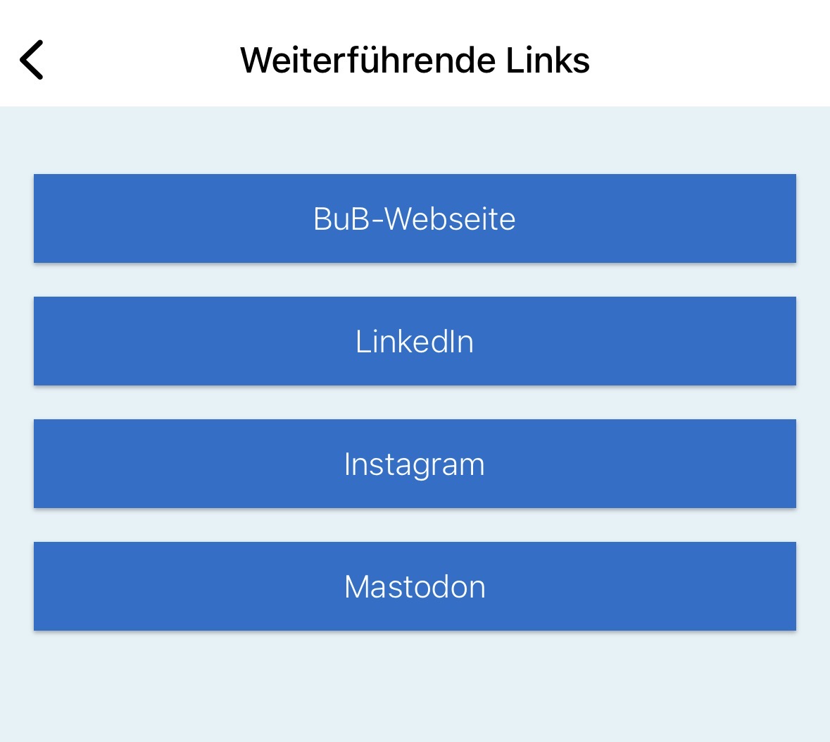 Unter »Weiterführende Links« können Sie die BuB-Webseite aufrufen sowie die BuB-Profile auf LinkedIn, Instagram und Mastodon besuchen.