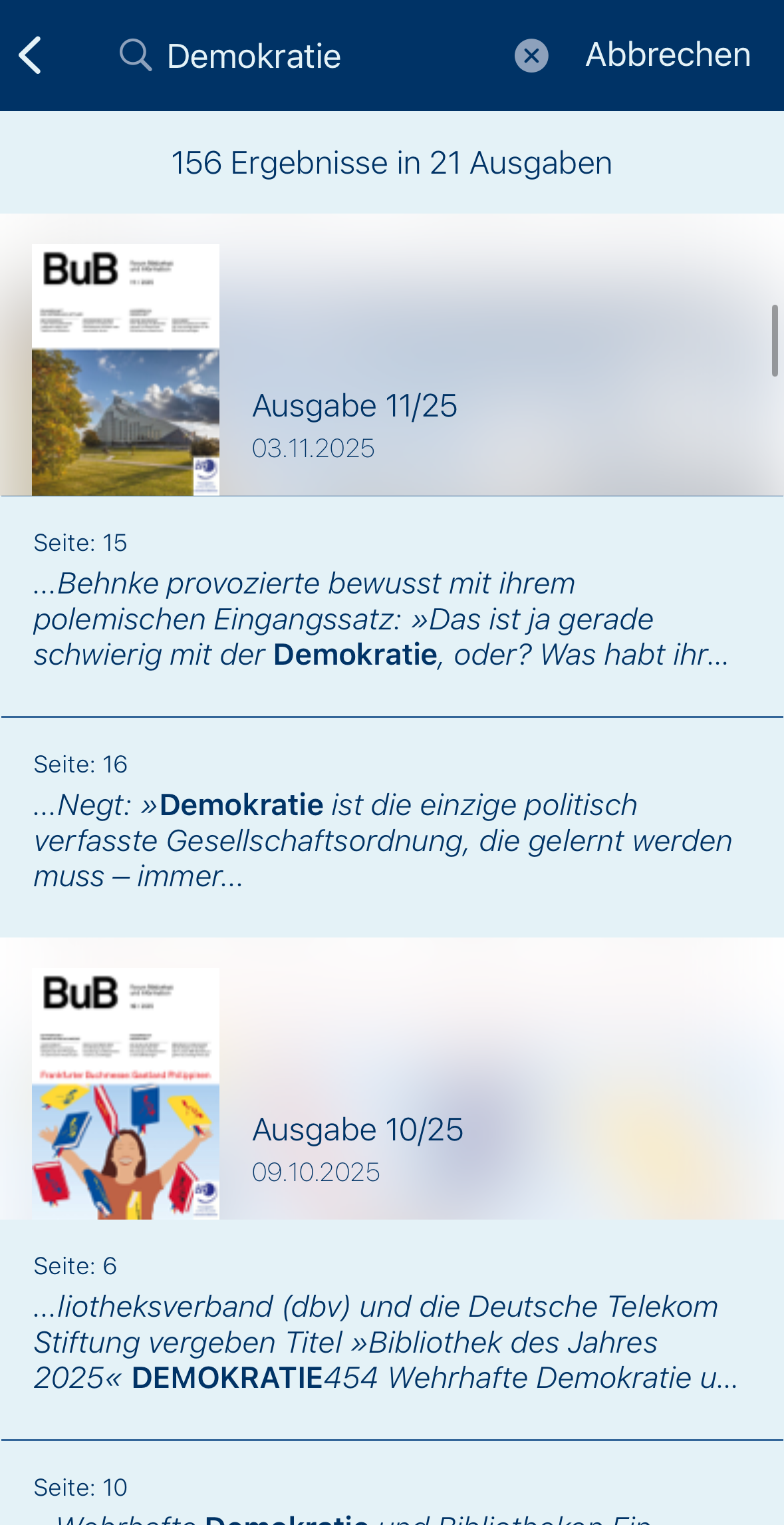 2.2 Anschließend werden die BuB-Ausgaben angezeigt, in denen Ihr Suchbegriff vorkommt, inklusive der entsprechenden Textabschnitte.
