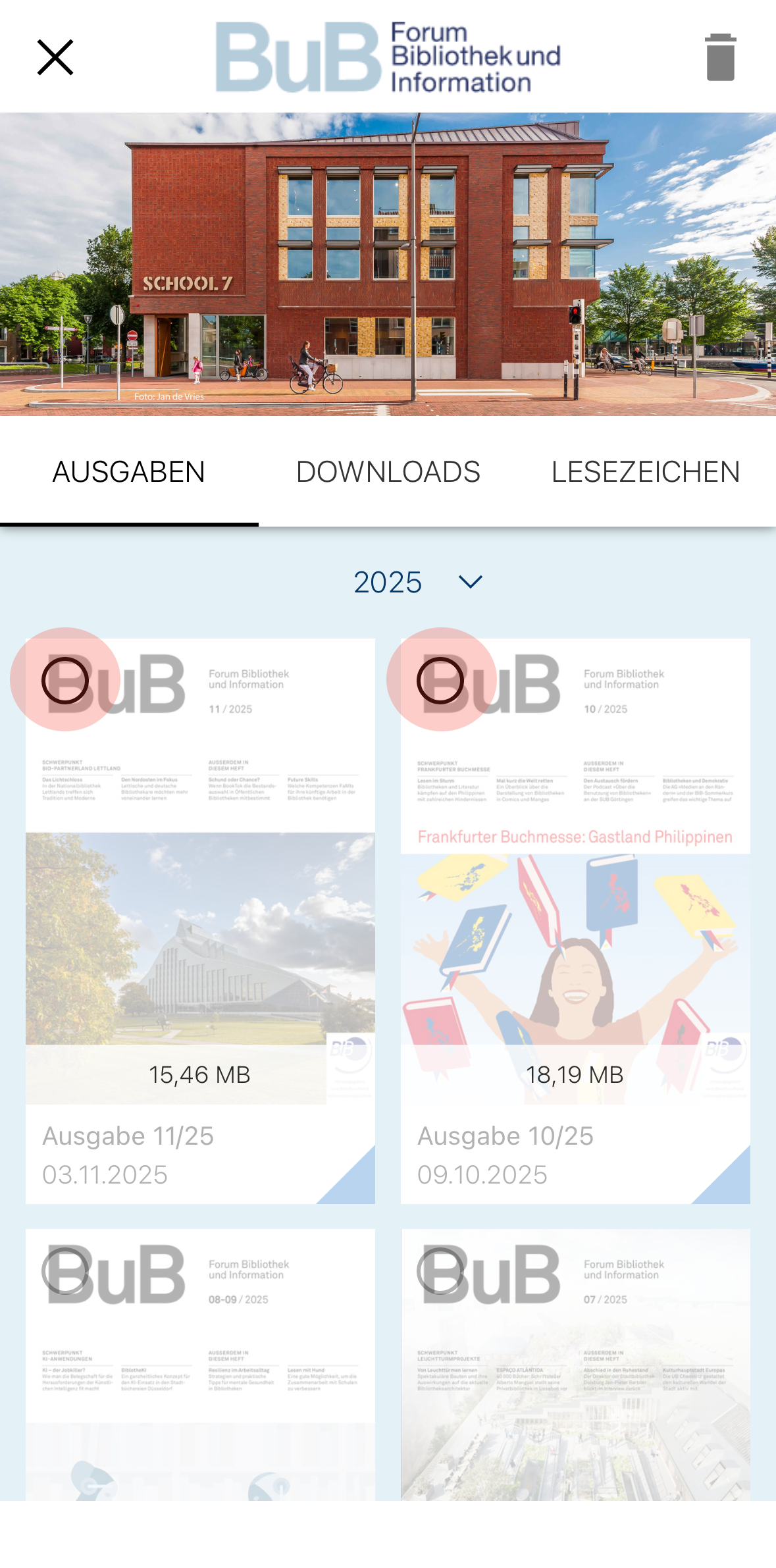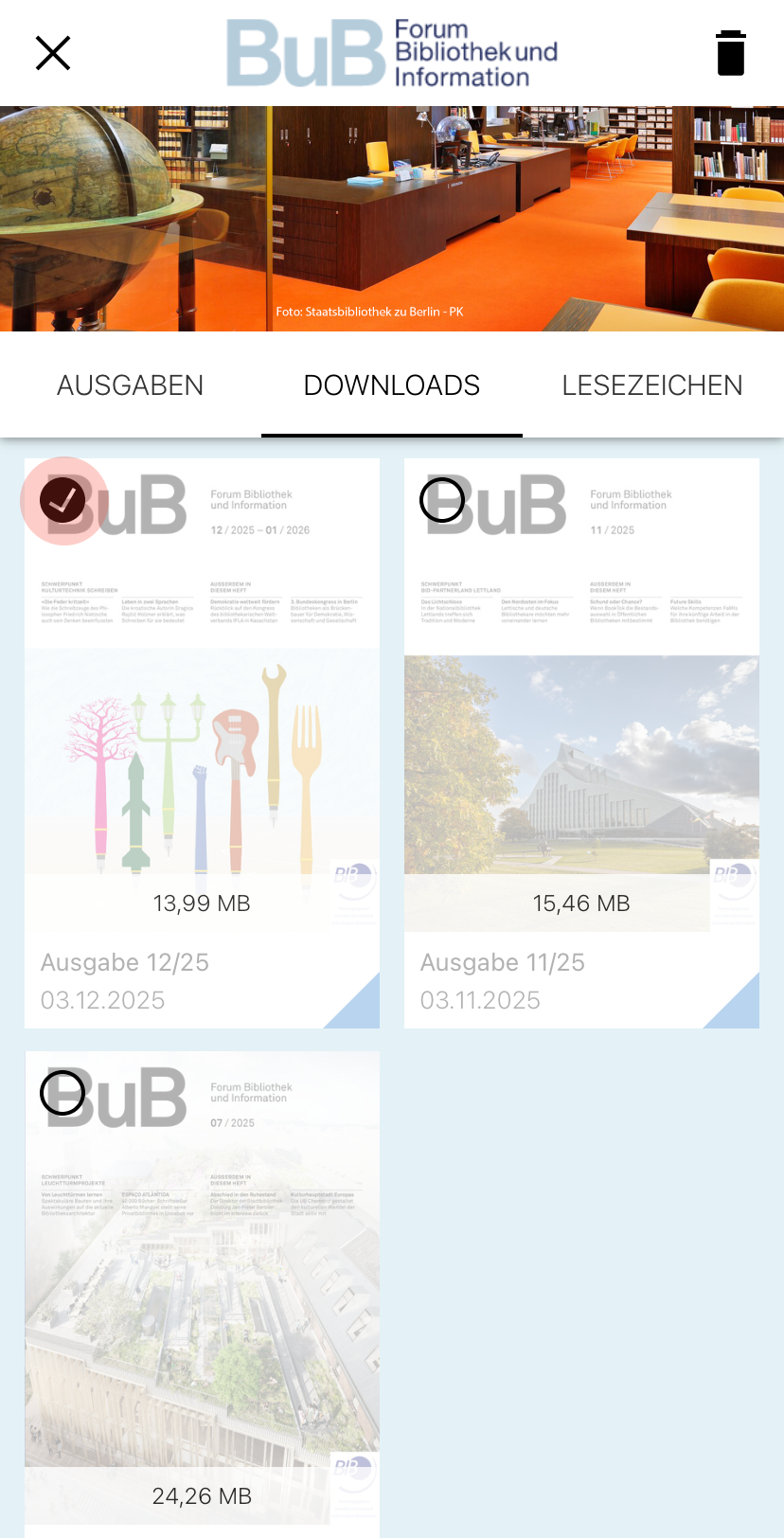 3.1 Nun erscheinen oben links an jeder heruntergeladenen BuB-Ausgabe kleine Kreise. Tippen Sie auf einen oder mehrere Kreise, um die gewünschten Ausgaben auszuwählen.