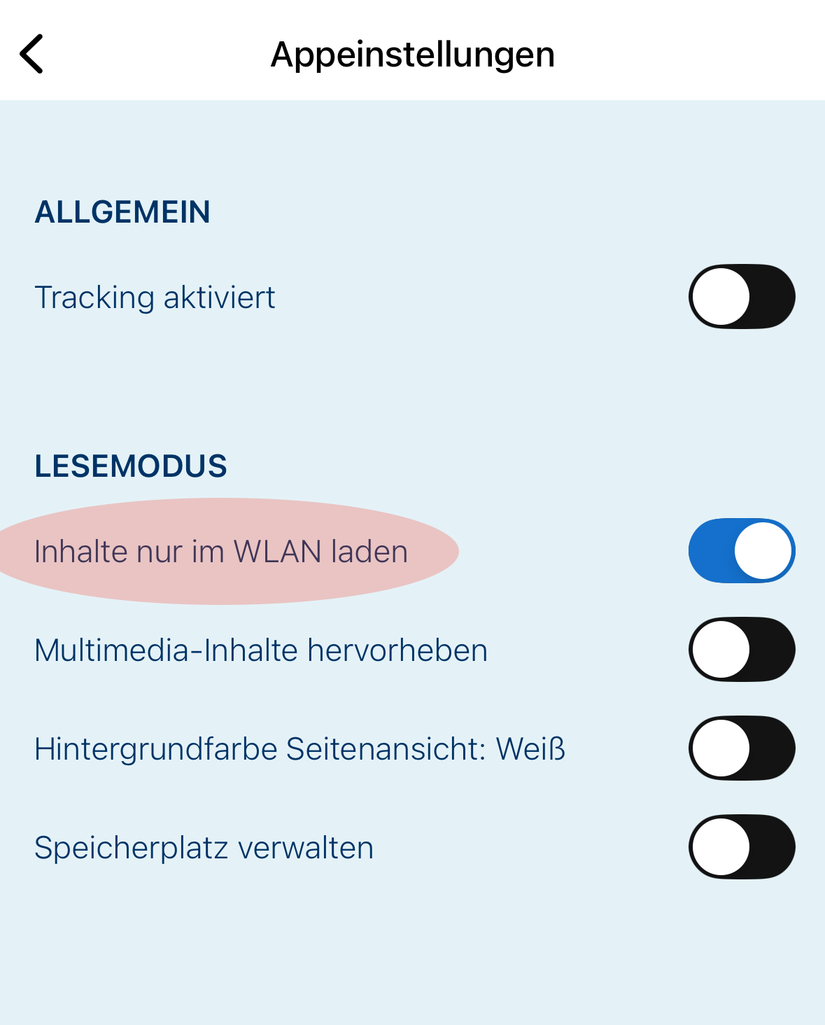 Sie können festlegen, dass Inhalte nur heruntergeladen werden, wenn Sie mit einem WLAN verbunden sind. Dies ist sinnvoll, wenn Ihr Datenvolumen begrenzt ist.