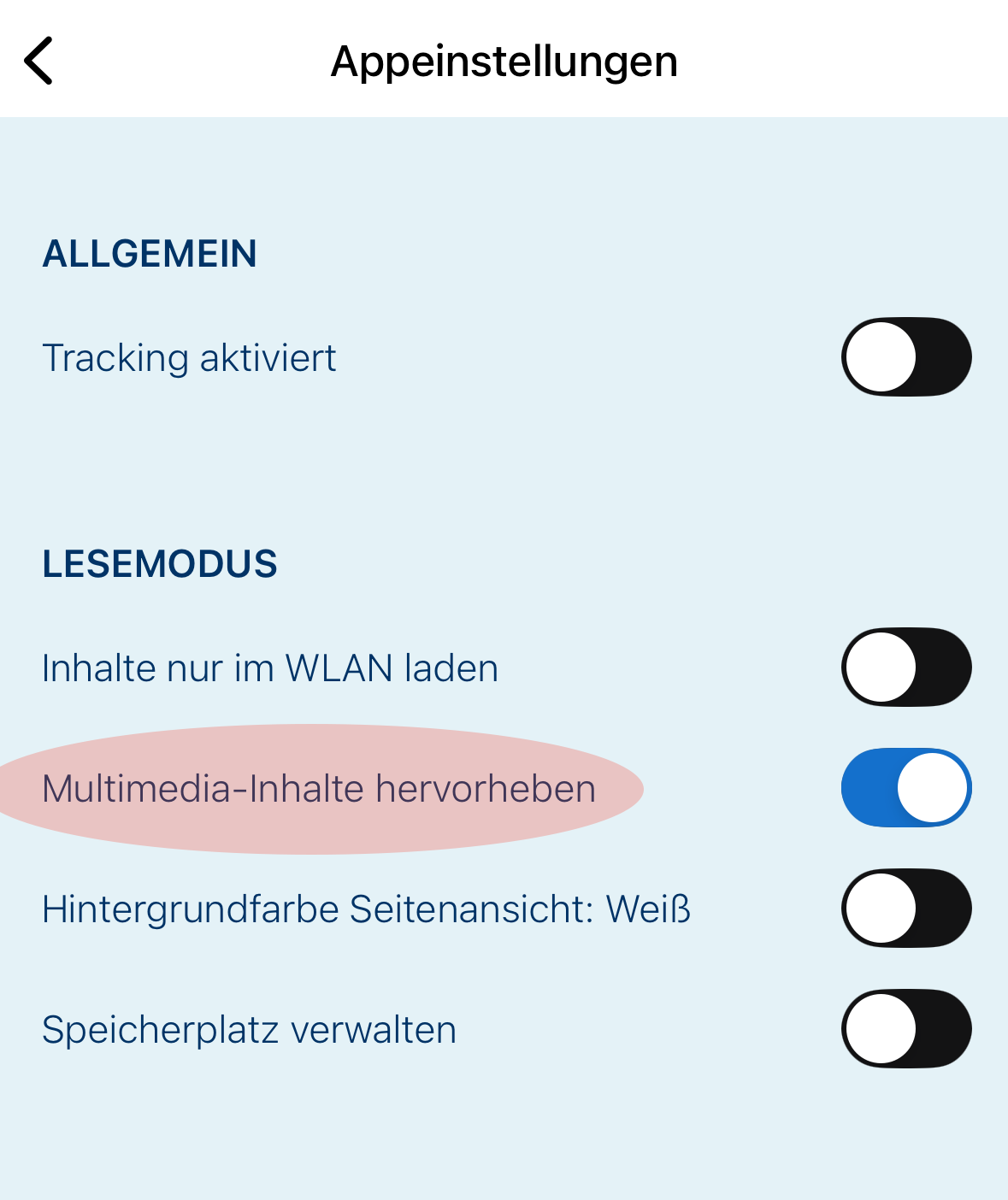 Hier können Sie einstellen, ob Multimedia-Inhalte durch Antippen der Seite hervorgehoben werden.
