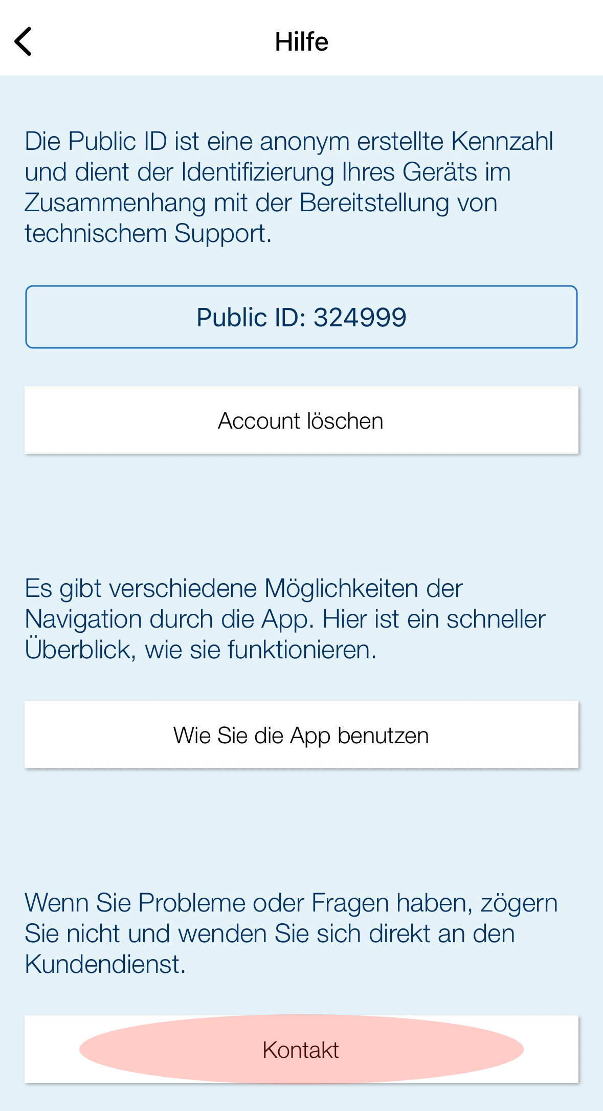 Unter »Kontakt« können Sie dem Kundendienst eine Nachricht schreiben, zum Beispiel bei technischen Problemen oder wenn Sie Hilfe benötigen.