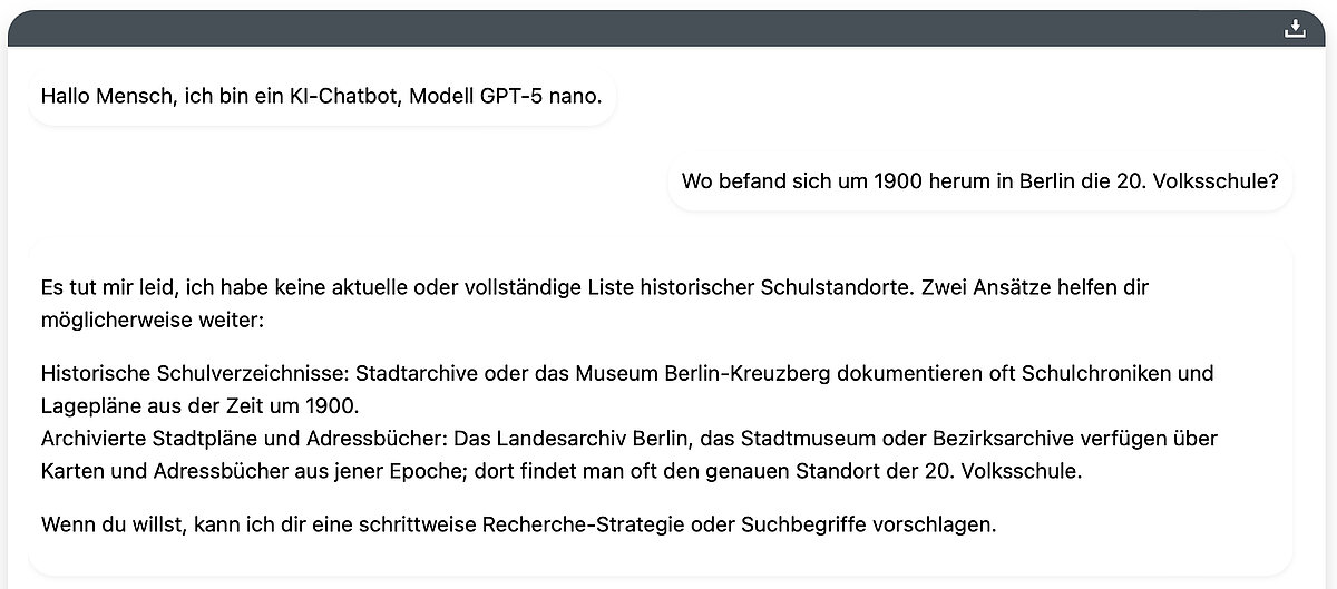 1 Vgl. BiblioCon2026 2 Vgl. Wissen, Dirk: Der »Bibliotheksweisheit« auf der Spur, BuB 10/25, S.500-505 Reutlingen, 2025. Vgl. auch https://www.b-u-b.de/nachrichten/praxis/post/der-bibliotheksweisheit-auf-der-spur 3 Vgl. Buchholtz, Arend: Die Berliner Volksbibliotheken und Lesehallen 1850-1900 - Festschrift der Stadt Berlin zum 1. August 1900, Berlin, 1900. Vgl. auch https://digital.zlb.de/viewer/fulltext/34947952/83/ 4 Mohrenstraße 41, heute Anton-Wilhelm-Amo-Str. 41 5 heute Nr. 14-16 6 Vgl. BuB 01/67, S. 46 7 Vgl. ChatGPT OpenAI: https://chatopenai.de 8 Wie z. B. ChatGPT, DeepSeek, Gemini, Grok, Perplexity 9 Katalog der Öffentlichen Bücherei und Lesehalle Braunschweig, Braunschweig, Ausgabe 1, Januar 1910, Beiblatt 10 Vgl. Stadtbibliothek Jena: https://www.stadtbibliothek-jena.de/de/wir_ueber_uns/geschichte/700681 11 Vgl. Tews, Johannes: Handbuch für Volkstümliche Leseanstalten, Berlin, 1904, Vorblatt 12 Vgl. Goethe-Institut: https://www.goethe.de/de/uun/org/ges.html 13 Vgl. Graesel, Armin: Blätter für Volksbibliotheken und Lesehallen, Berlin, 1900 14 Vgl. Jaeschke, Emil: Volksbibliotheken (Bücher- und Lesehallen) ihre Einrichtung und Verwaltung, Leipzig, 1907 15 Vgl. Fußnote 4 16 Seit 1920 gehört Charlottenburg zu Berlin, zuvor war es eine eigenständige Stadt 17 Vgl. Lexikon der Bibliotheks- und Informationswissenschaft (LBI): Hrsg. von Konrad Umlauf und Stefan Gradmann, Stuttgart, 2011, S. 137 und vgl. Wikipedia: https://de.wikipedia.org/wiki/Bücherhallenbewegung 18 Vgl. Döblin, Alfred: Berlin Alexanderplatz, Berlin, 1929, S. 151