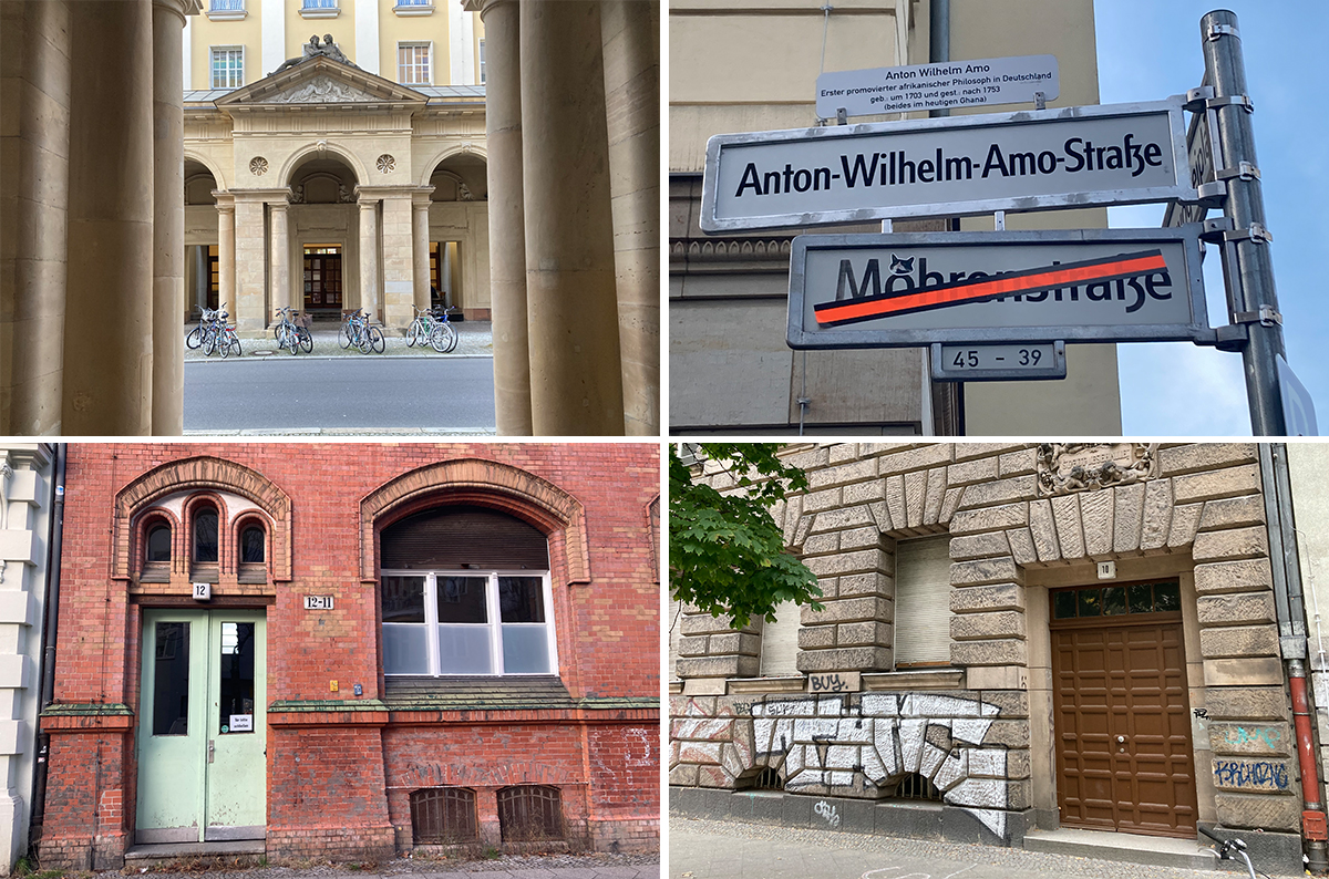 oben links: Erste Lesehalle in Berlin (ehemals Mohrenstr. 41): Eingang Anton-Wilhelm-Amo-Str. 41, oben rechts: Schild der heutigen Anton-Wilhelm-Amo-Str., unten links: Zweite Lesehalle in Berlin: Eingang Ravenéstr. 12, unten rechts: Dritte Lesehalle in Berlin: Eingang Wilmsstr. 10