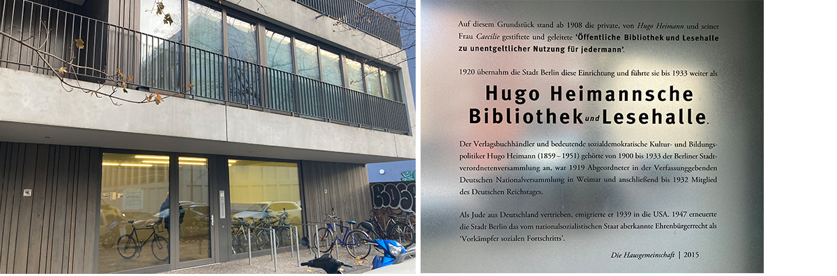Möglicherweise werden bis zur BiblioCon nicht nur die hier aufgeführten Adressen angezeigt, sondern darüber hinaus auch weitere Informationen zu finden sein, wie zum Beispiel, dass es ab 1908 in einem Gartenhaus der Adalbertstraße 41 die Hugo Heimann'sche Bibliothek und Lesehalle gab (gegründet 1899 in der Alexandrinenstraße 26). Im heutigen neueren Gebäude haben die Bewohner im Treppenhaus ein Hinweisschild angebracht, welches darauf aufmerksam macht.