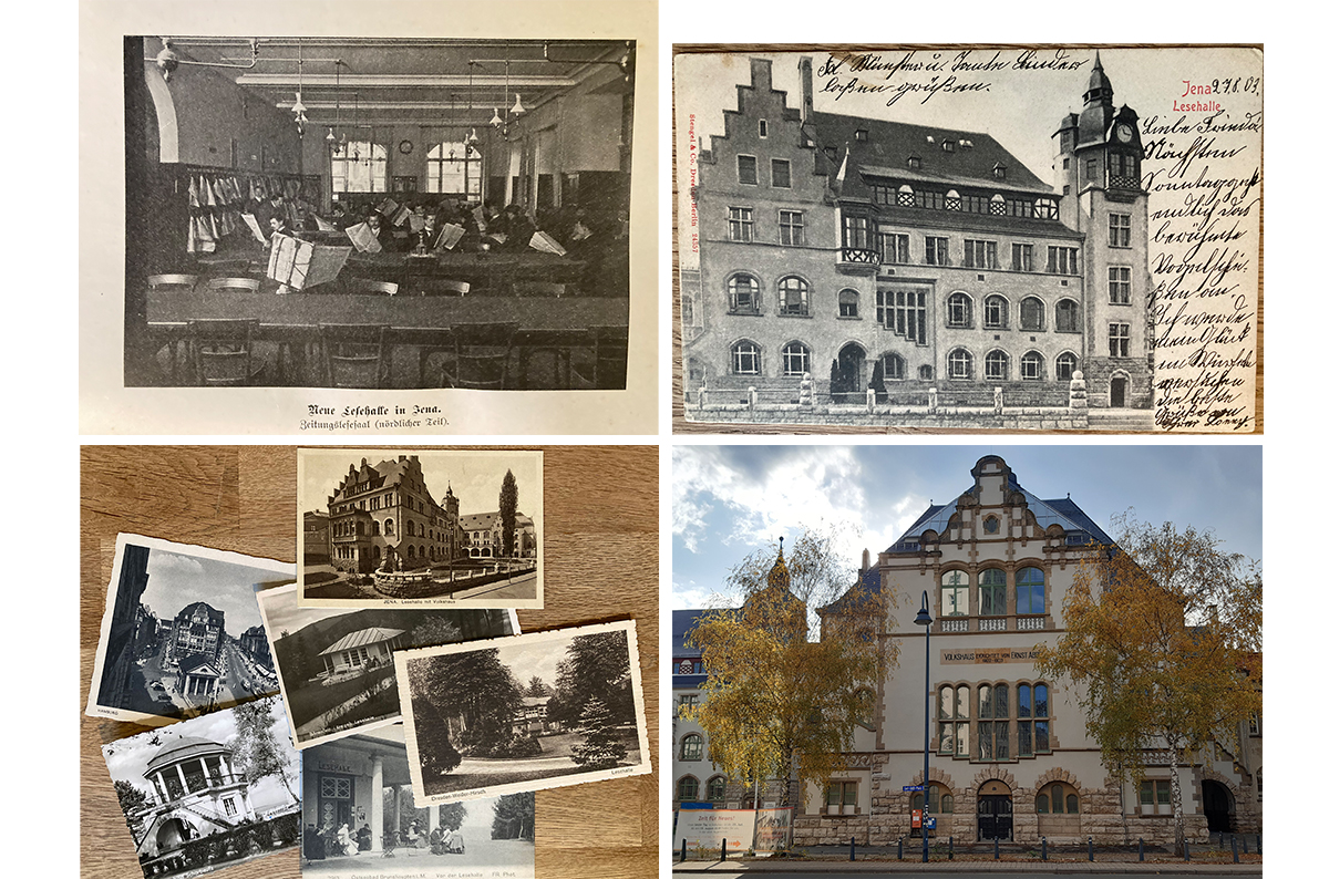 links oben: Fachbuch mit Abbildung des damaligen Zeitungslesesaals in Jena, um 1904, rechts oben: Postkarte Jena Lesehalle, datiert 27.8.1903, links unten: Diverse historische Postkarten von Lesehallen, rechts unten: Perspektivwechsel der Fassade des damaligen Volkshauses in Jena, 2025