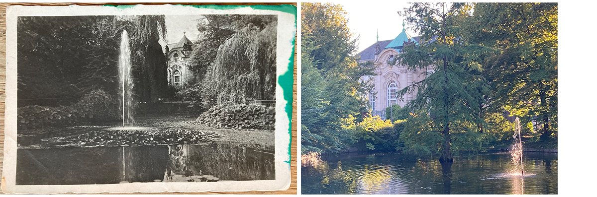 links: Historische Postkarte aus Bad Oeynhausen, um 1953 »Goldfischteich und Lesehalle«, rechts: Vergleichsfoto zur historischen Postkarte vor Ort im Jahr 2025