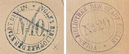 Besitzstempel der 10. und 20. Berliner Volksbibliothek (1. und 2. Lesehalle), um 1900