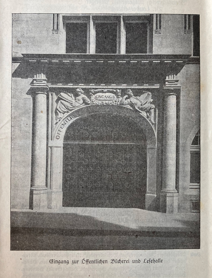 In mehreren Fachbüchern wird neben Bremen, Charlottenburg, Hamburg und Jena auch immer wieder Braunschweig beispielhaft mit Fotos der damaligen Lesehalle aufgeführt. Lag dies an dem dort recht aktiven Kollegium, das seine Lesehalle in Fachpublikationen präsentierte oder einfach nur daran, dass damals dort eine Fotokamera existierte? So ist in einer Beilage zum »Katalog der Öffentlichen Bücherei und Lesehalle Braunschweig«9 das Eingangsportal mit der Bildunterschrift »Eingang der Öffentlichen Bücherei und Lesehalle« zu sehen. Ob über diesem »Eingang.B« als Schriftzug das Wort »Lesehalle« zu lesen war, lässt das historische Foto nicht erkennen, doch ist dies vielleicht gegenwärtig vor Ort möglich?